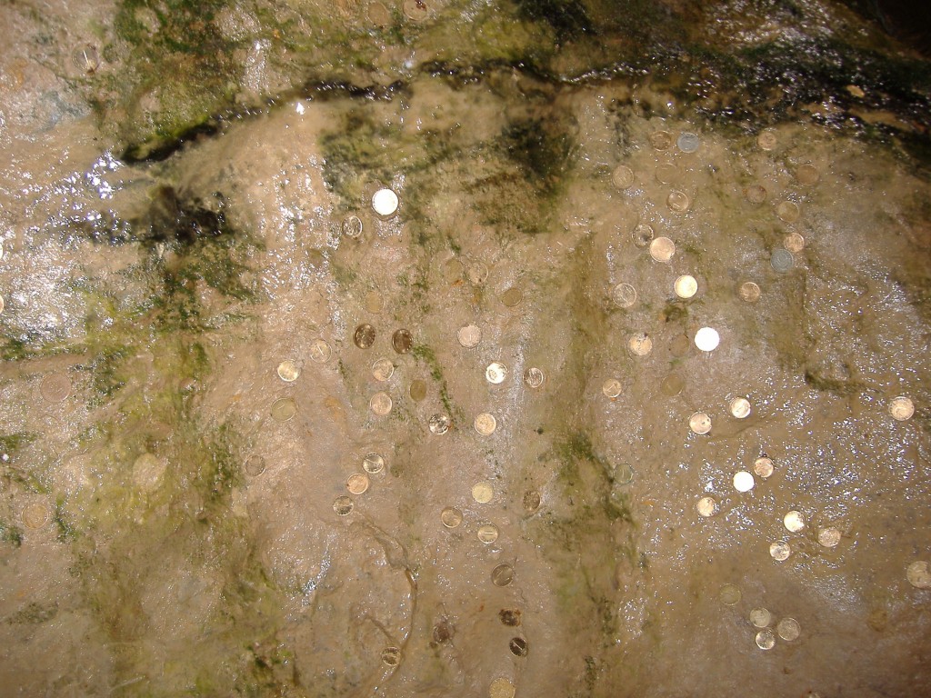 Pestera Bacho Kiro-monede lipite pe pereti