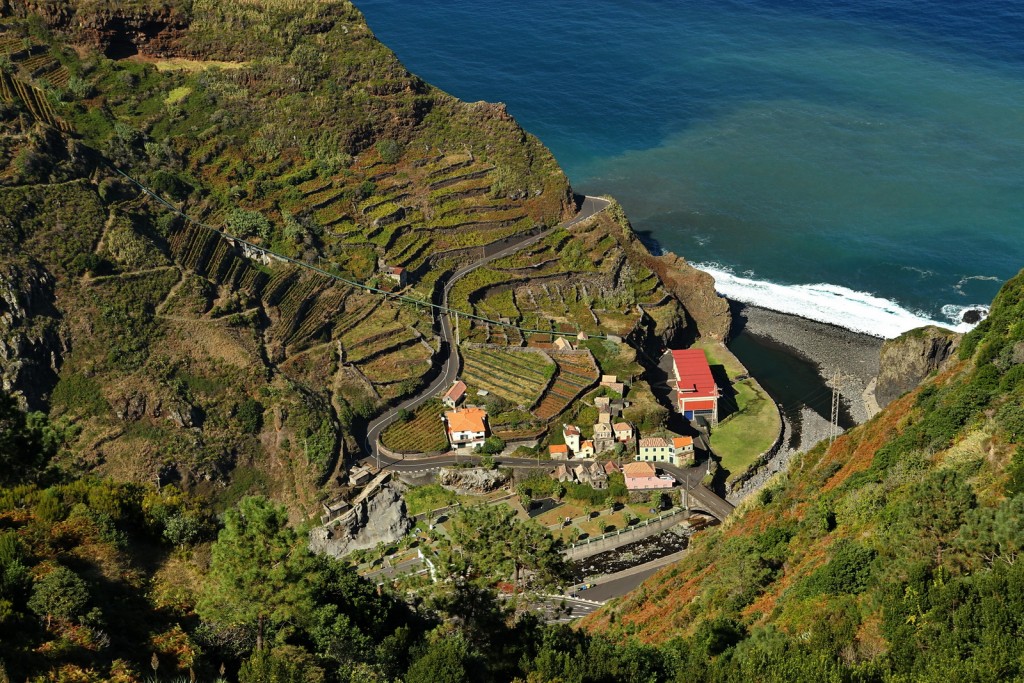 De sus de la Ribeira de Janela priveliste spre locul de varsare a raului unde e si o mica hidrocentrala si un camping