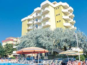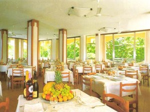 Hotelul: receptie, bar, camera de zi cu TV, sala de mese, piscina cu umbrelute si sezlonguri.